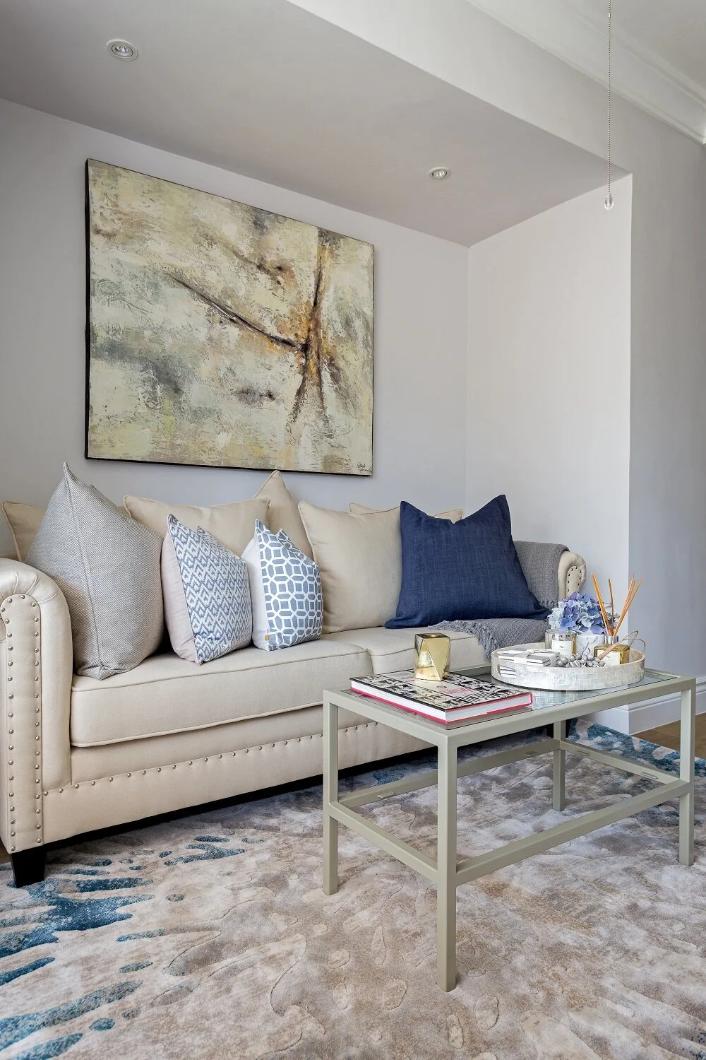 The client loves grey and had her walls recently painted grey. We developed a complementary colour palette with shades of blue and cream to create a sophisticated, calming, and streamlined look throughout the area.