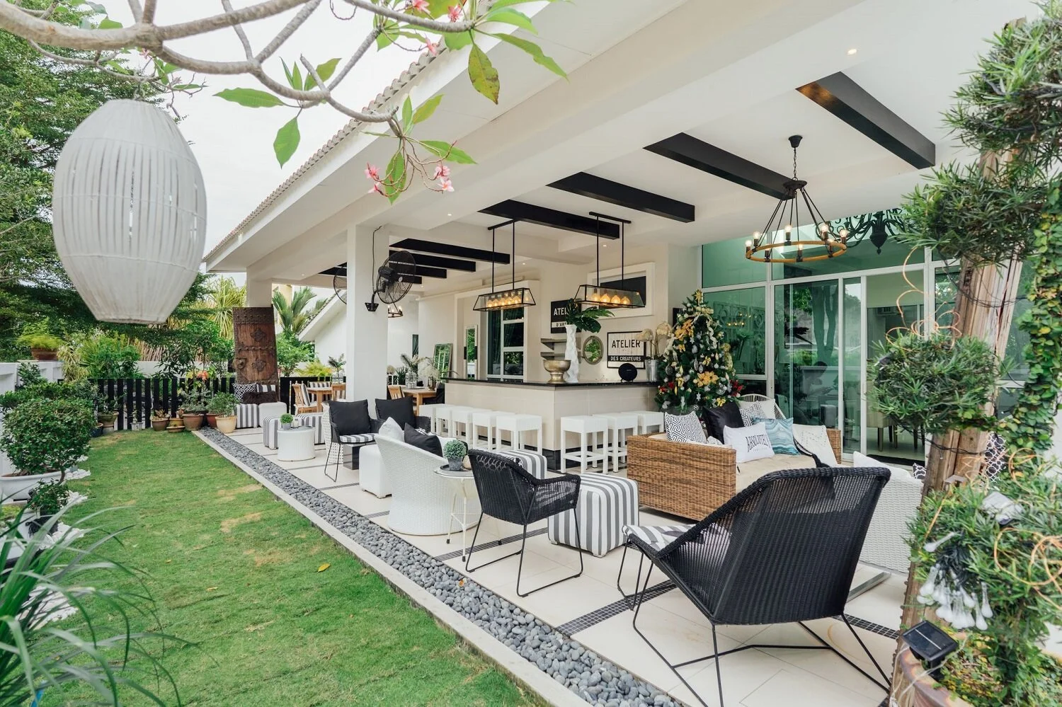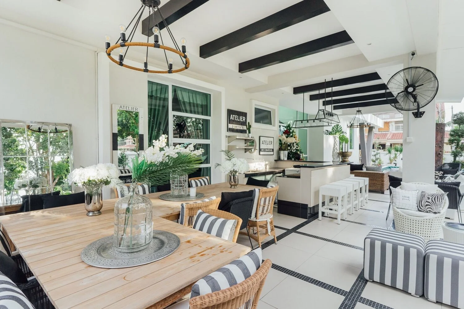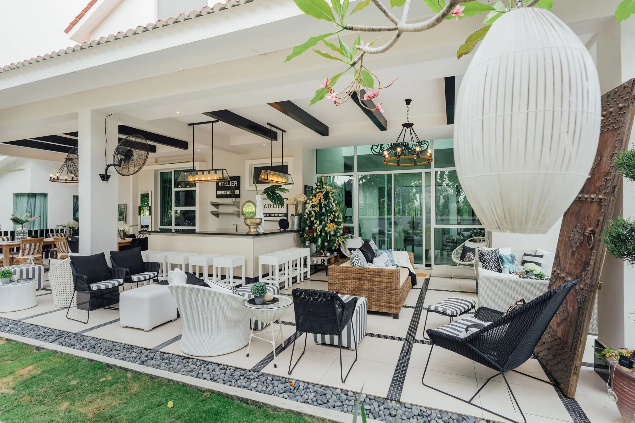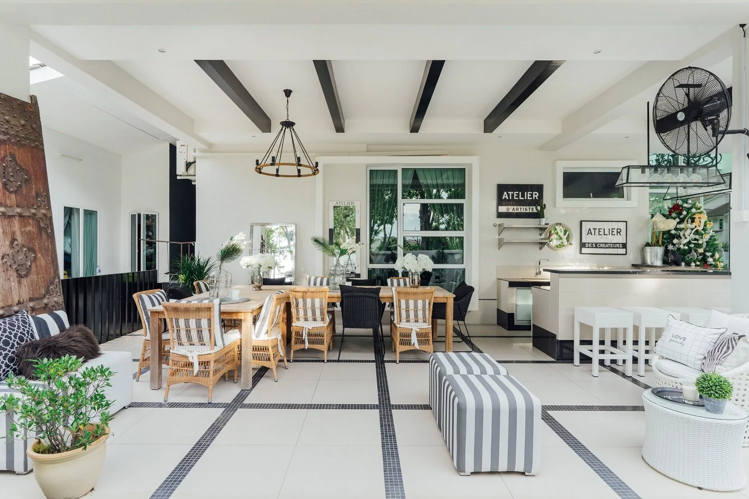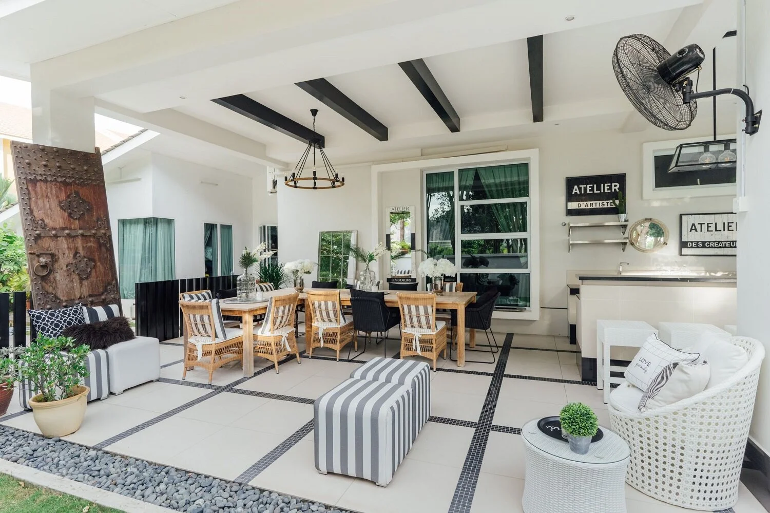 To emulate the feel of a breezy beach resort, the outdoors features a classic black-and-white palette with organic elements like rattan and linen.