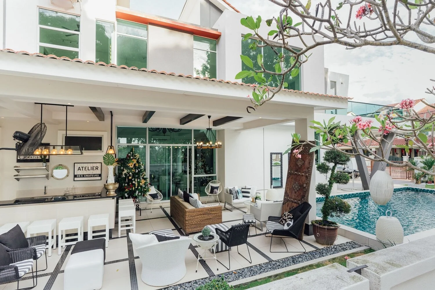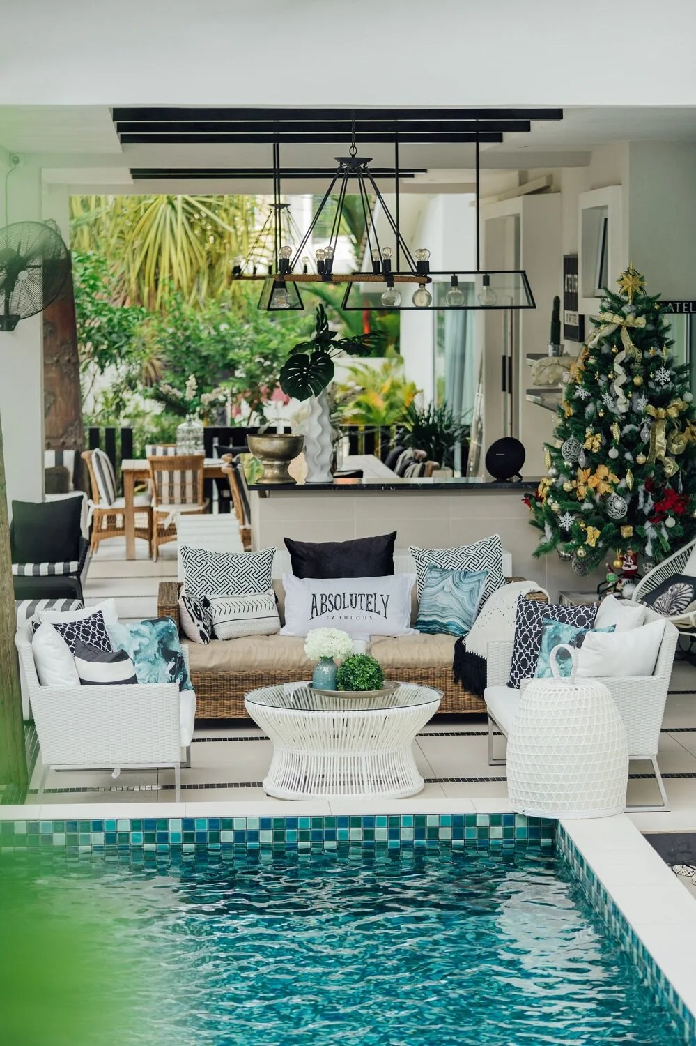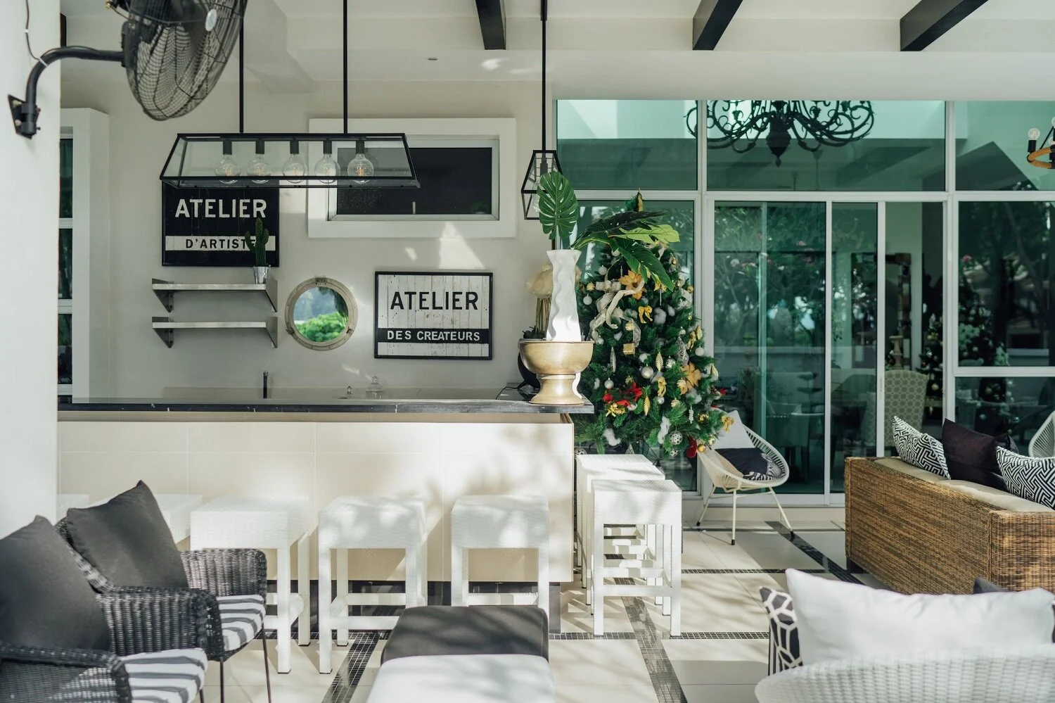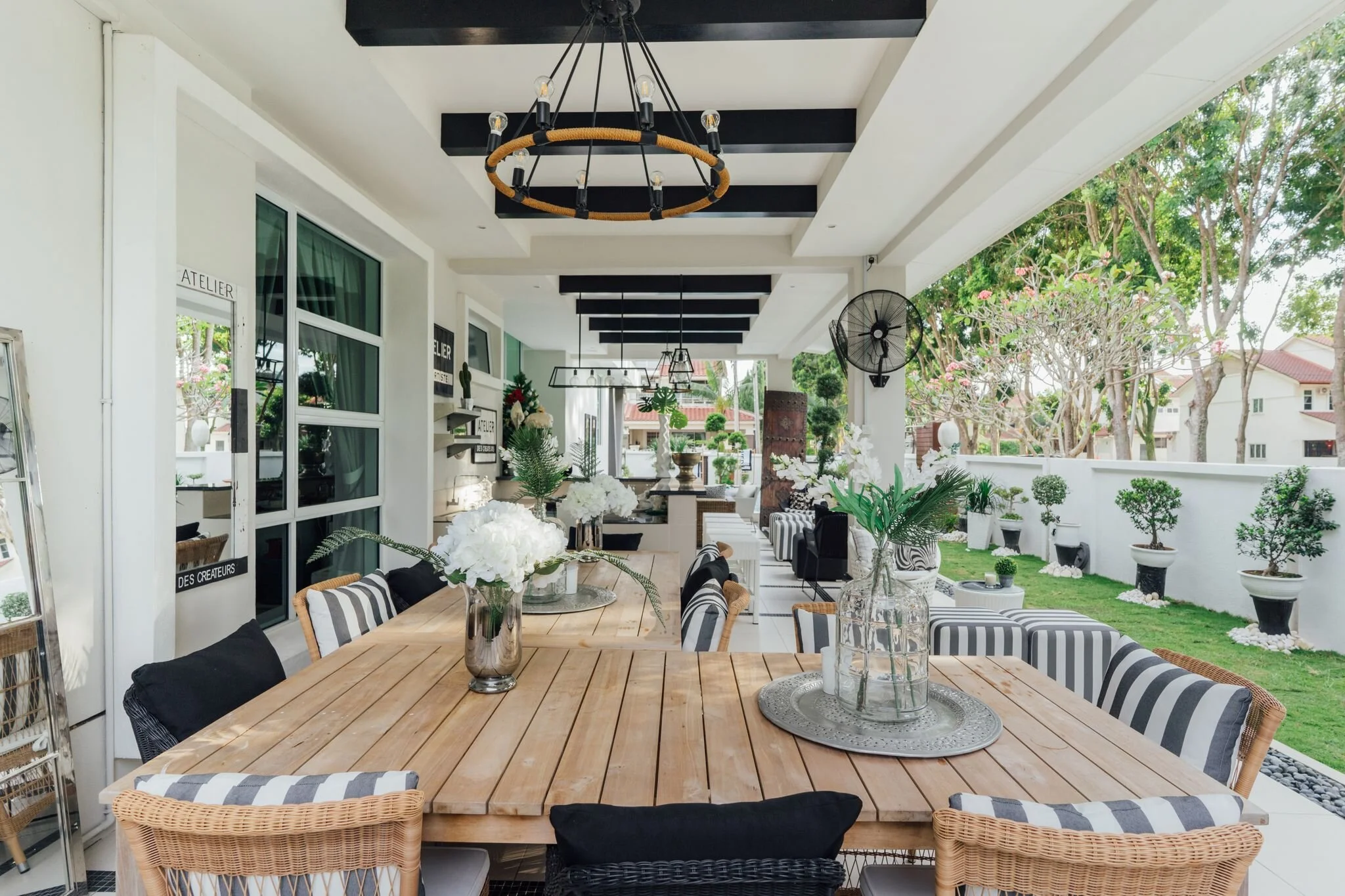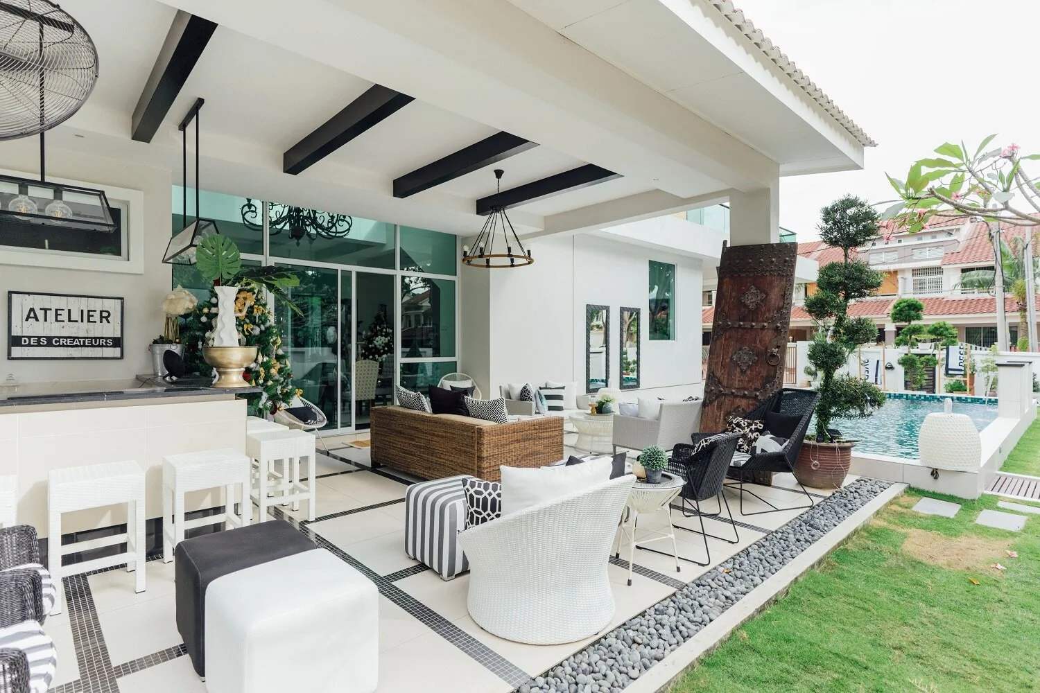 To emulate the feel of a breezy beach resort, the outdoors features a classic black-and-white palette with organic elements like rattan and linen.