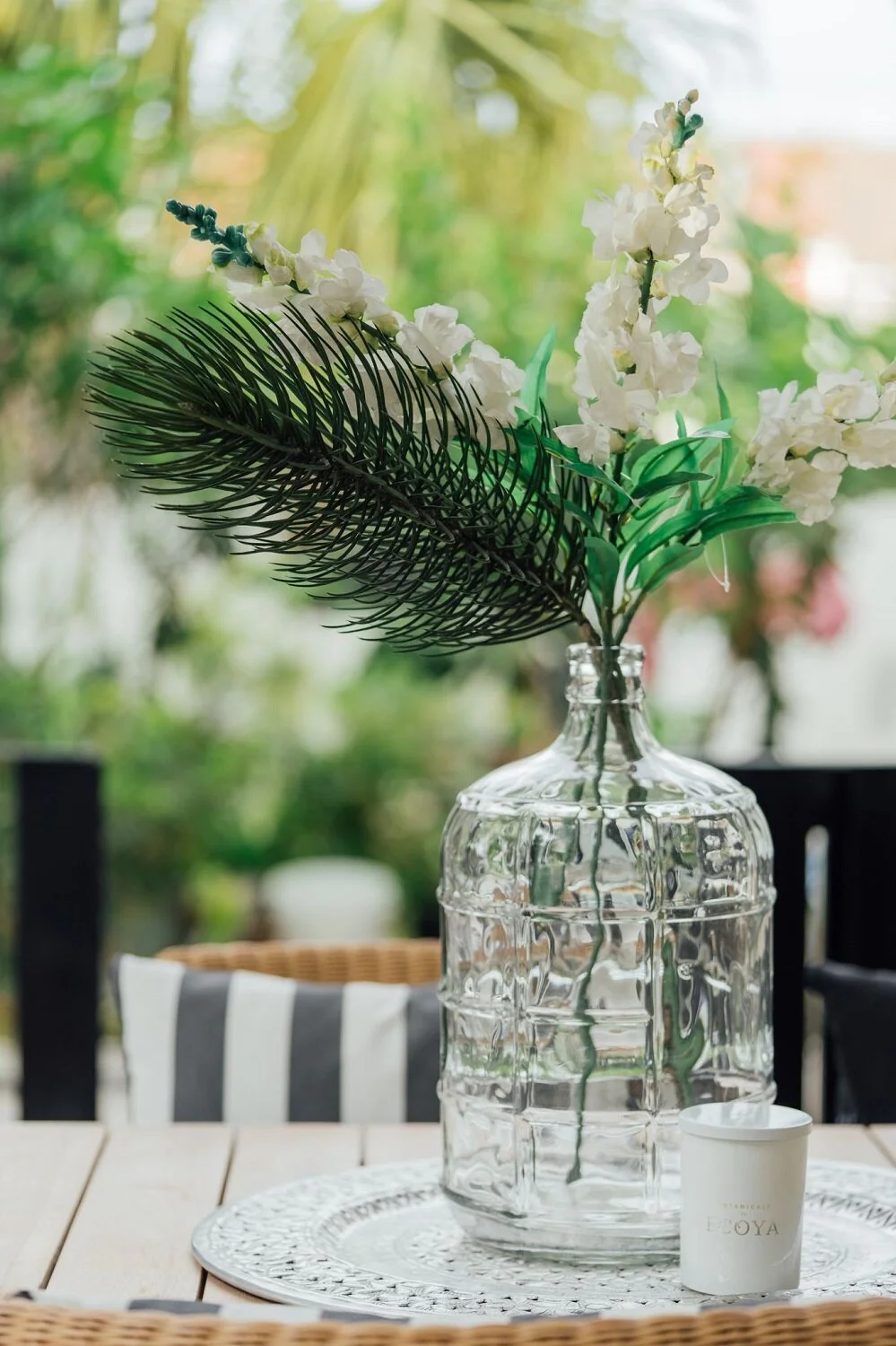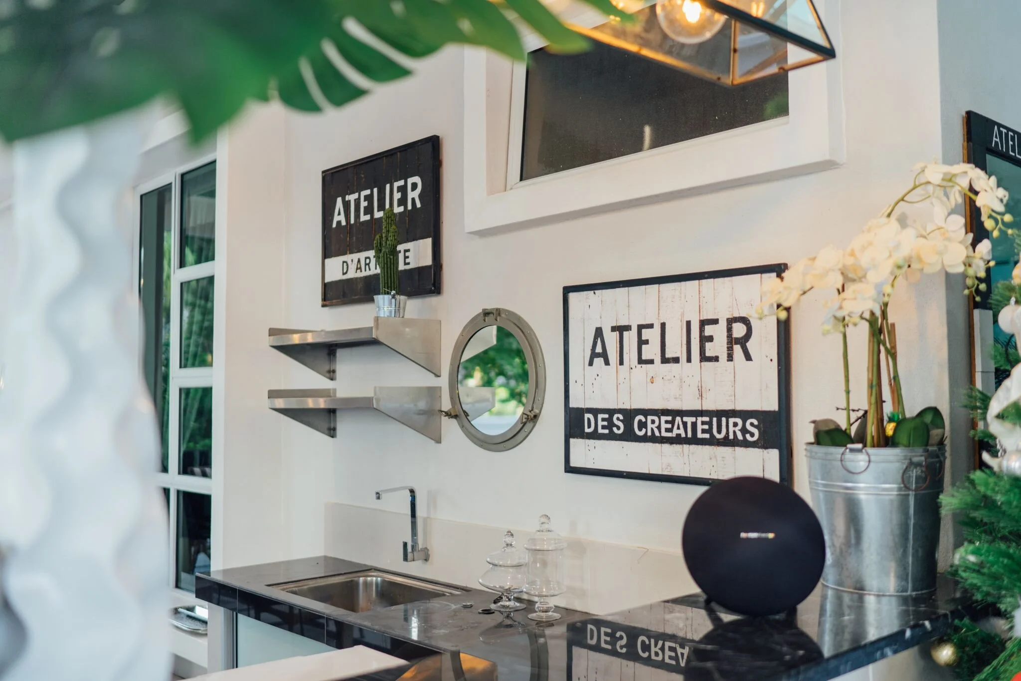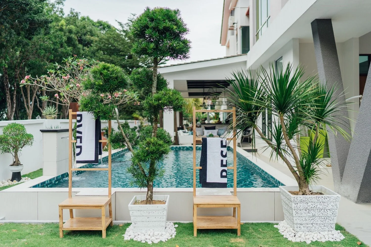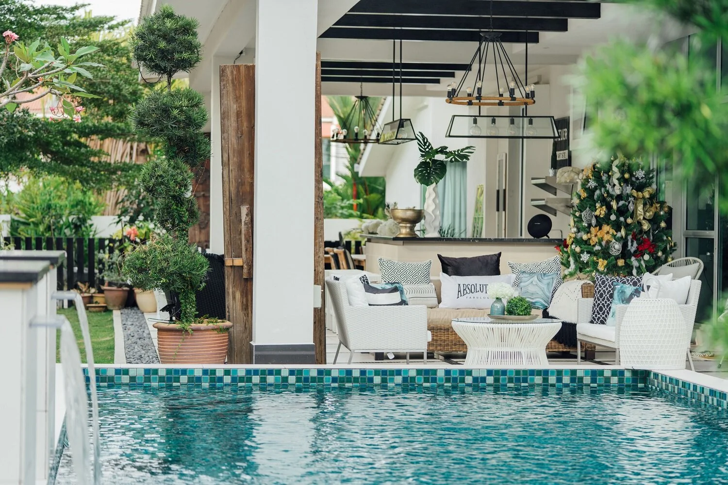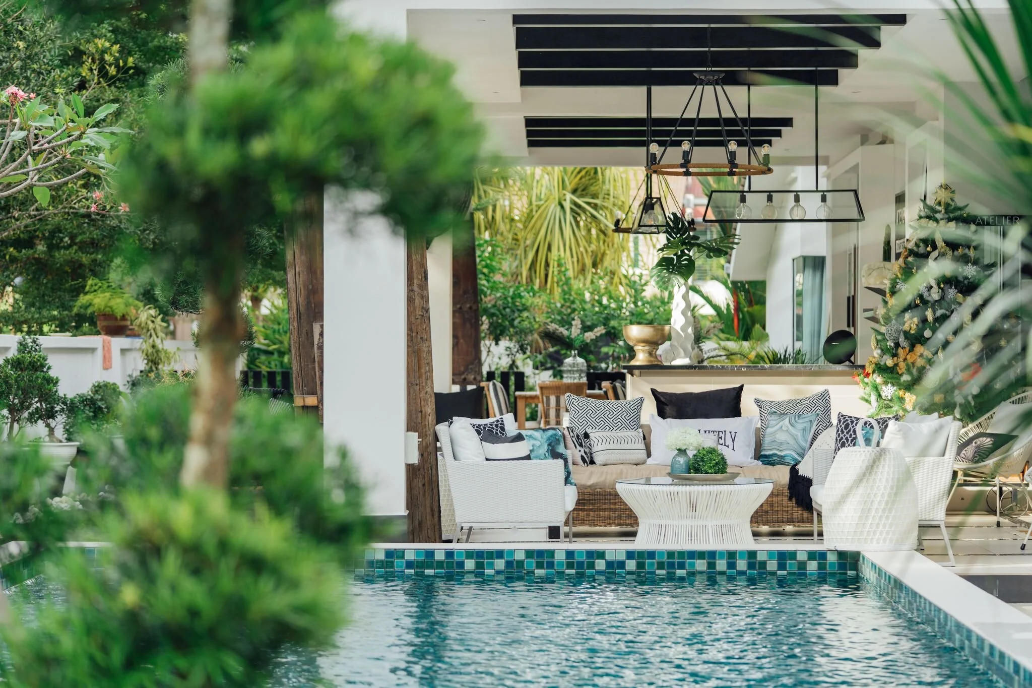 To emulate the feel of a breezy beach resort, the outdoors features a classic black-and-white palette with organic elements like rattan and linen.