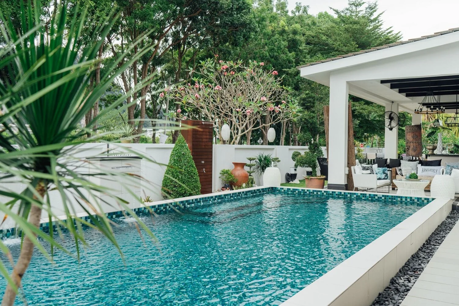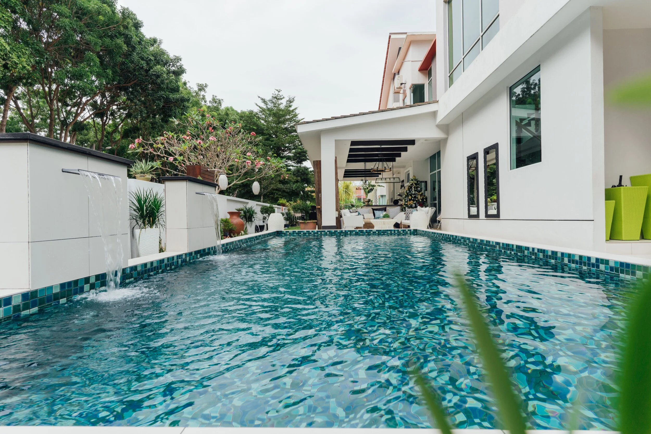 Family is important to Caroline and Eric, so this outdoor area was conceptualised for larger parties. The deck and pool were developed from scratch.