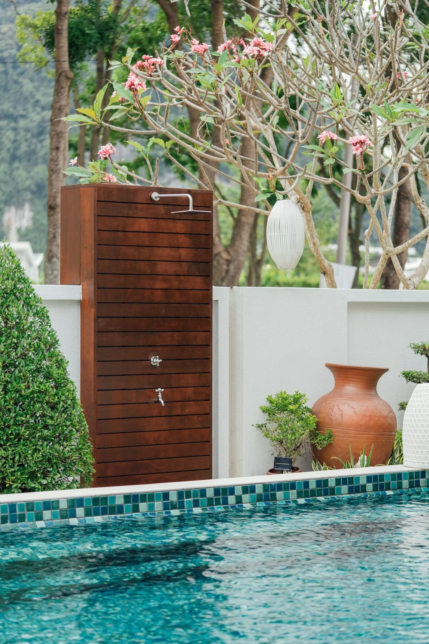 They built a bar counter for easy hosting. The bar, coupled with the pool, are the anchor points of the outdoor space.